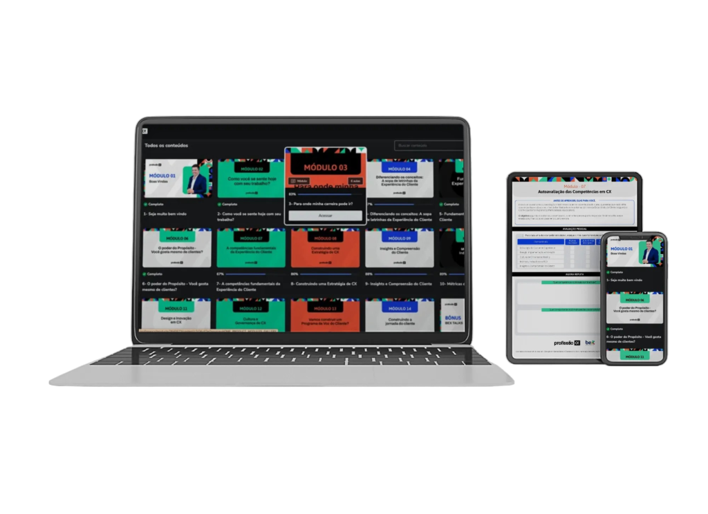 Você pode acessar o Profissão CX em qualquer lugar do mundo em todos os dispositivos: celular, computador, tablet e TV